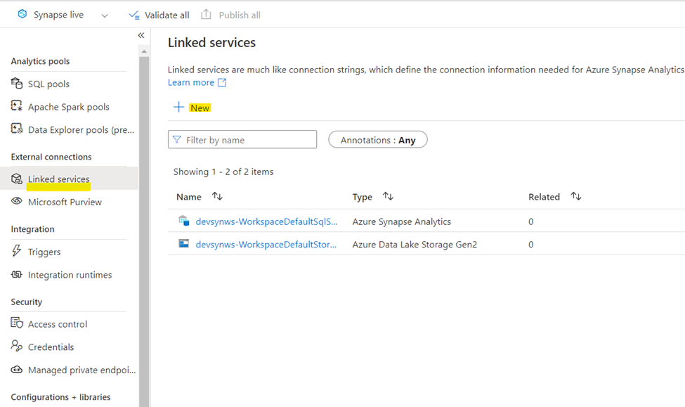 1. Open Synapse workspace and go to Linked Service under Manage option [this icon in right side]